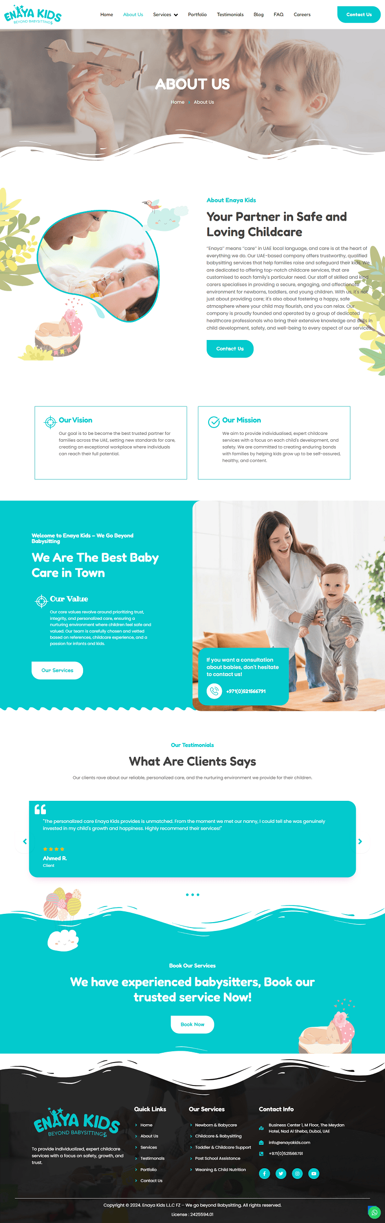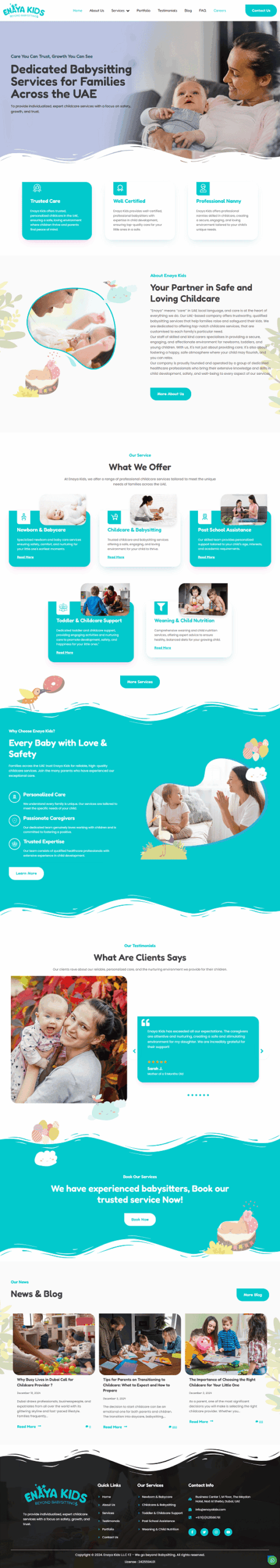 Enaya Kids is a UAE-based childcare company that offers a wide range of professionally-certified caregiving services — from newborn care and babysitting to toddler support, post-school assistance, weaning and child nutrition, and even prenatal classes. The client wanted a website that reflects their core values of trust, safety, and personalized care, while making it easy for parents to explore services, understand their options, and get in touch.