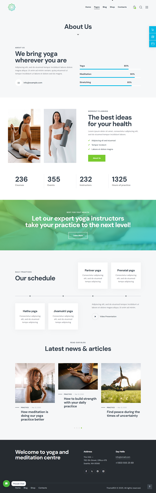 Class pages were organized so users can quickly understand what each session offers, while clear CTAs help convert visitors into students. The shop and blog were integrated naturally into the layout, allowing the site to support both wellness content and product sales. The design is fully responsive and built for easy updates using Elementor and ThemeREX tools.